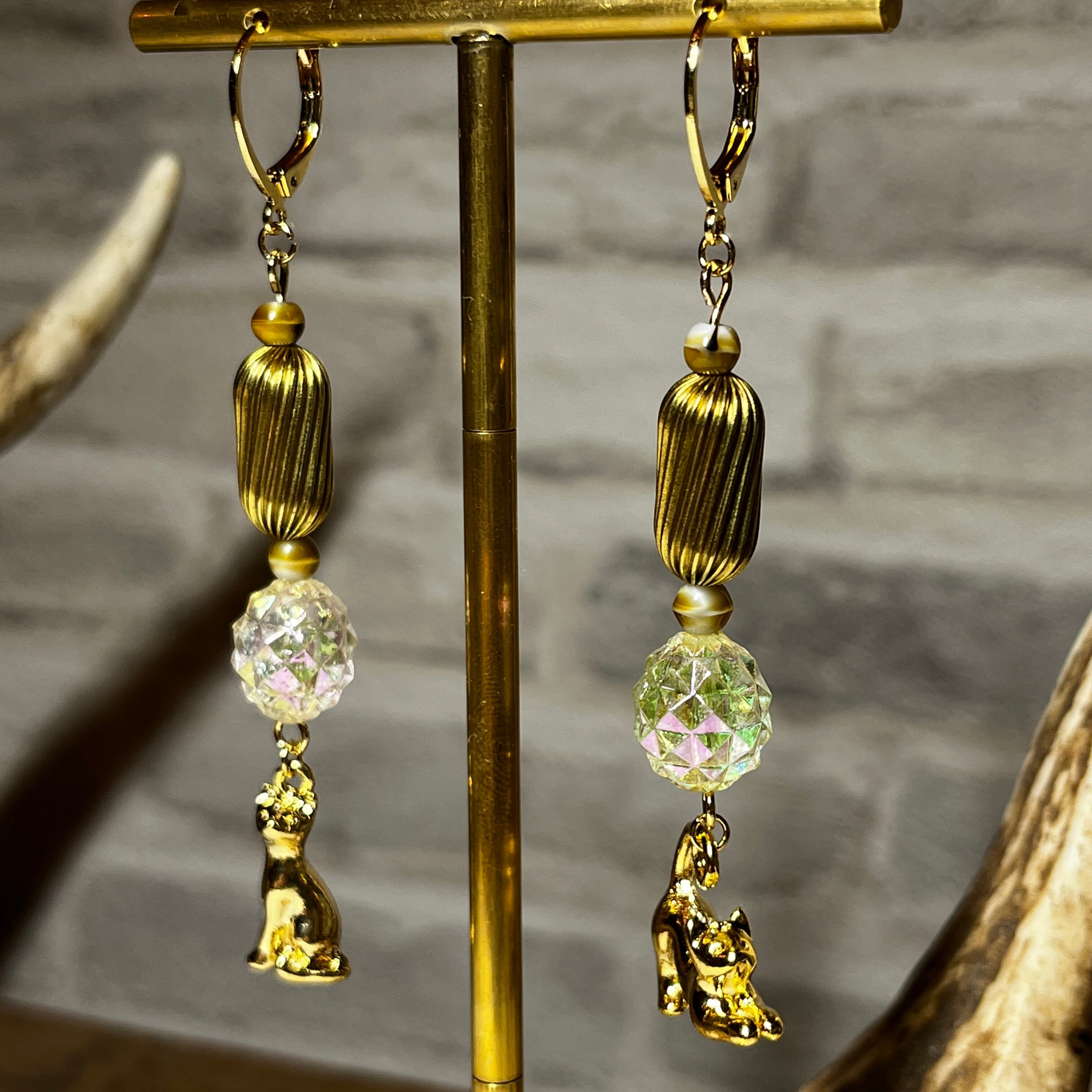 燻んだゴールド真鍮のねじりブラスが一気にヴィンテージ感をアップさせ七色の多面ビーズと合わせる事で光を反射させ動くたびにキラキラして重みのある猫ちゃんがシックな印象にしてくれます。