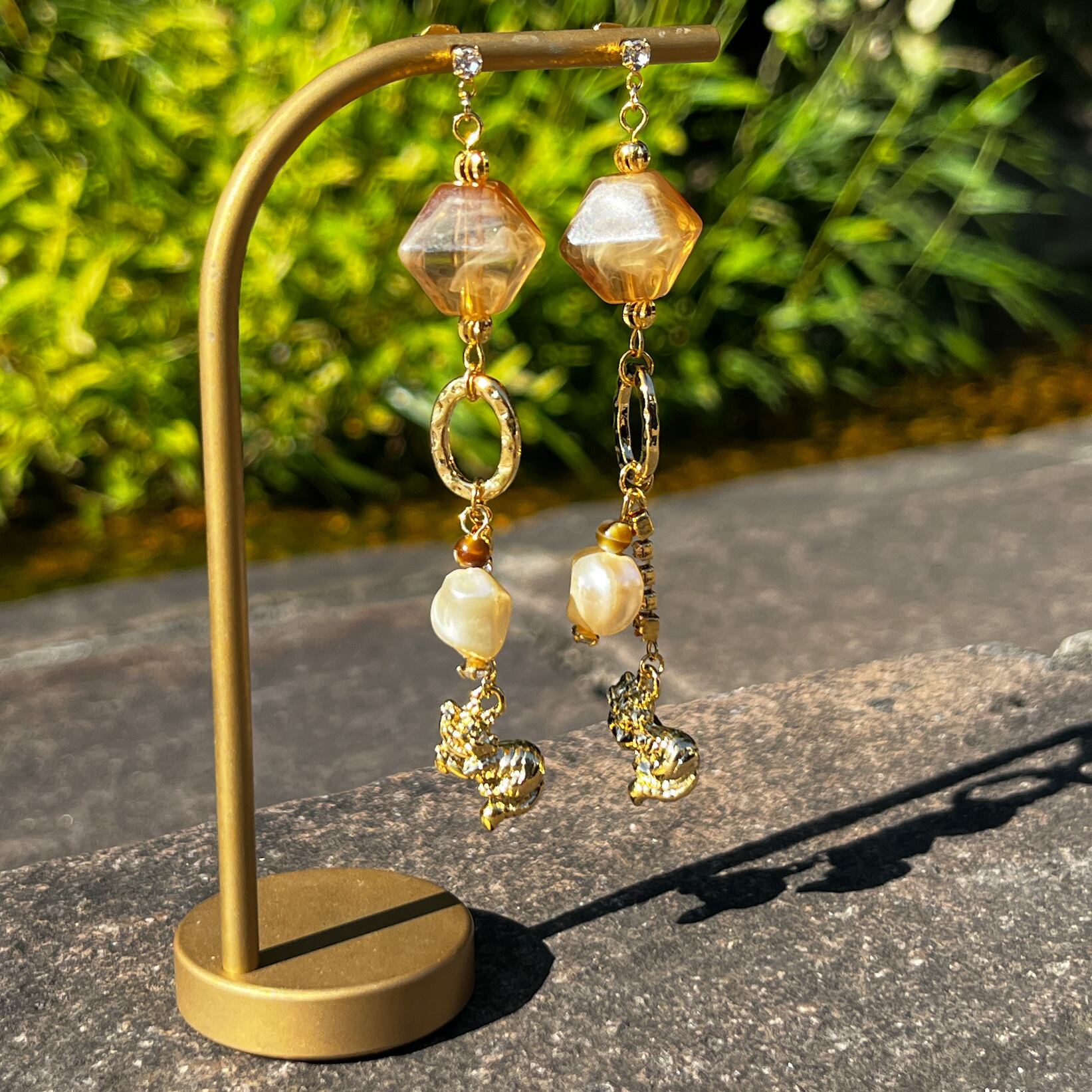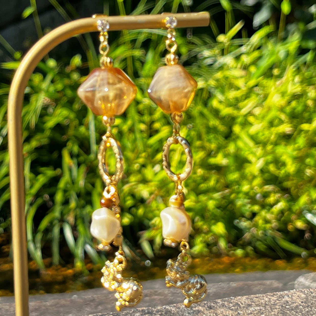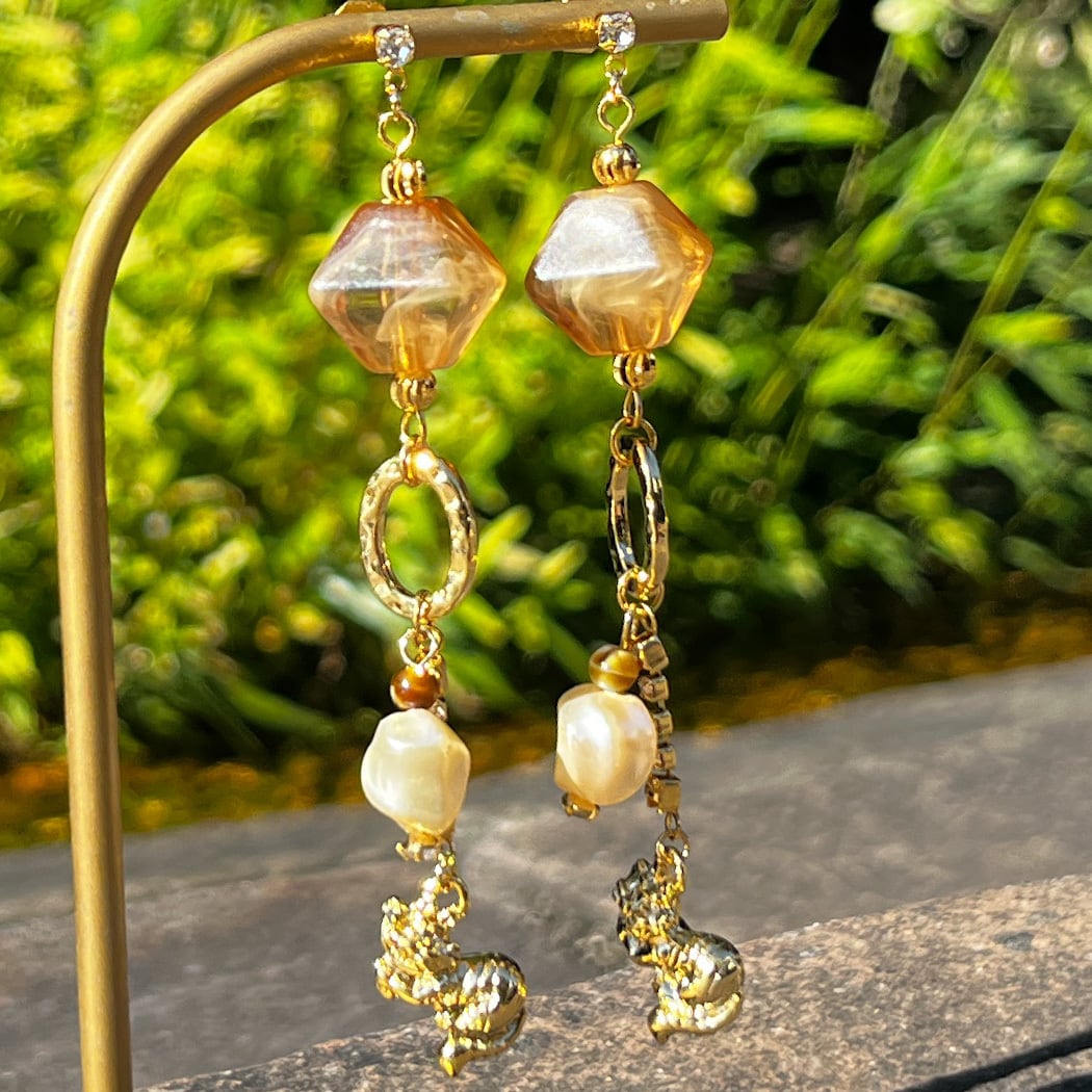 垂らした様な見る角度によっては色々な模様に透明感のあるピンクブラウンの中にホワイトを見える上から見るとスクエア横から見るとダイヤの可愛い形のビーズと捻りパールが甘過ぎず、K16GPのメルヘンなチェシャ猫を大人のアクセサリーとして仕上げて見ました。