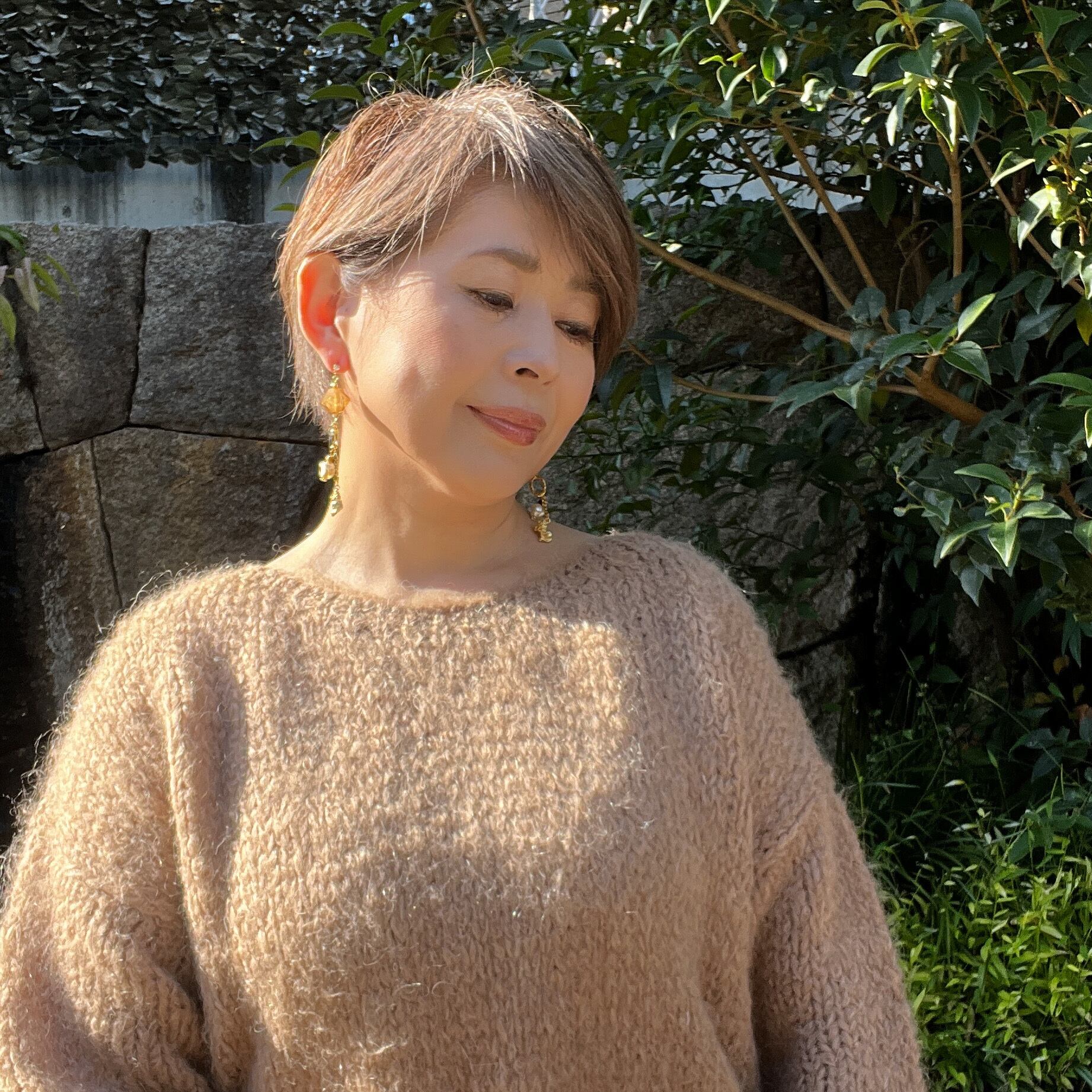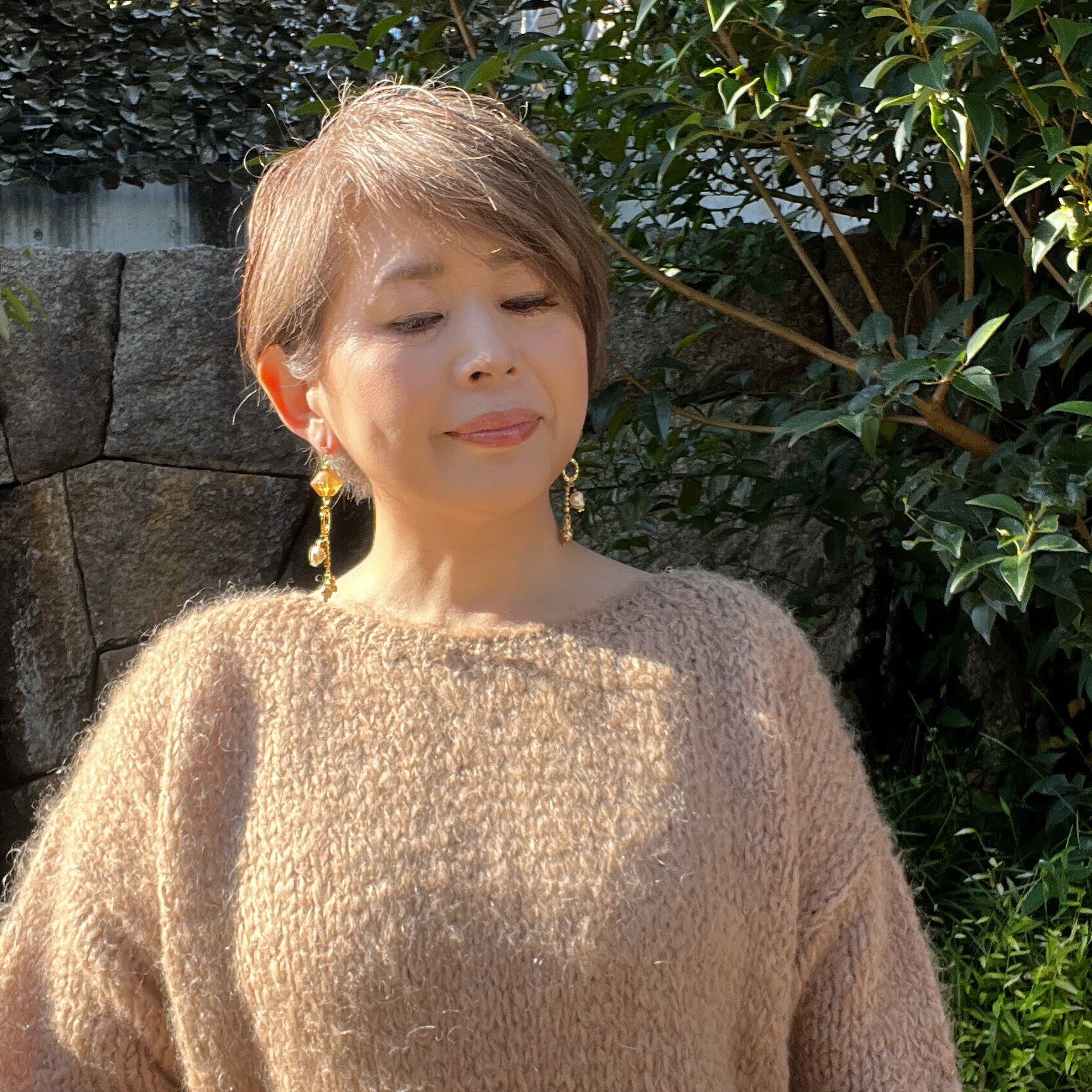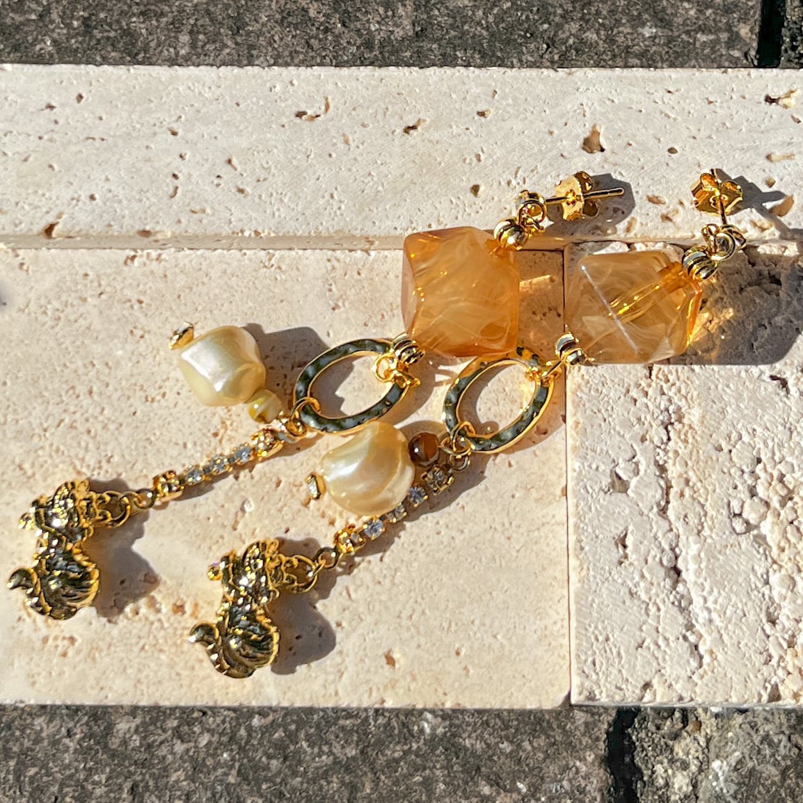 垂らした様な見る角度によっては色々な模様に透明感のあるピンクブラウンの中にホワイトを見える上から見るとスクエア横から見るとダイヤの可愛い形のビーズと捻りパールが甘過ぎず、K16GPのメルヘンなチェシャ猫を大人のアクセサリーとして仕上げて見ました。