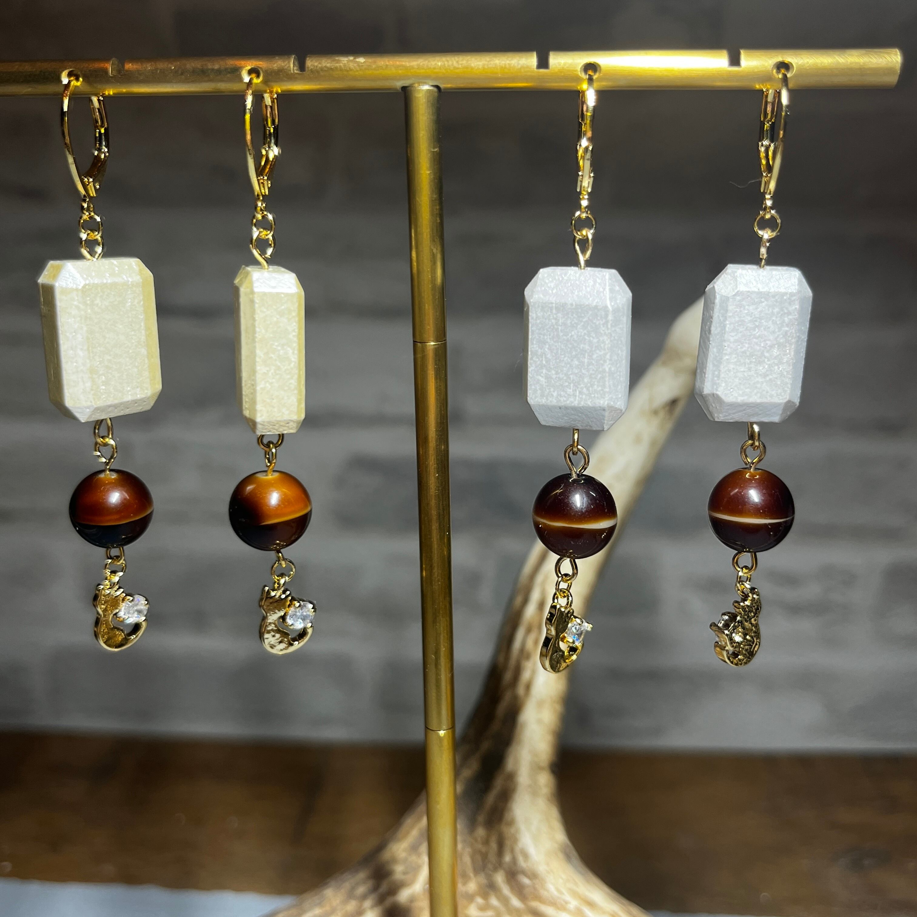 スクエアウッドビーズとヴィンテージブラウンビーズ (ホワイト)ジルコニアを持った猫 ヴィンテージアクセサリー K16GP イヤリング ピアス