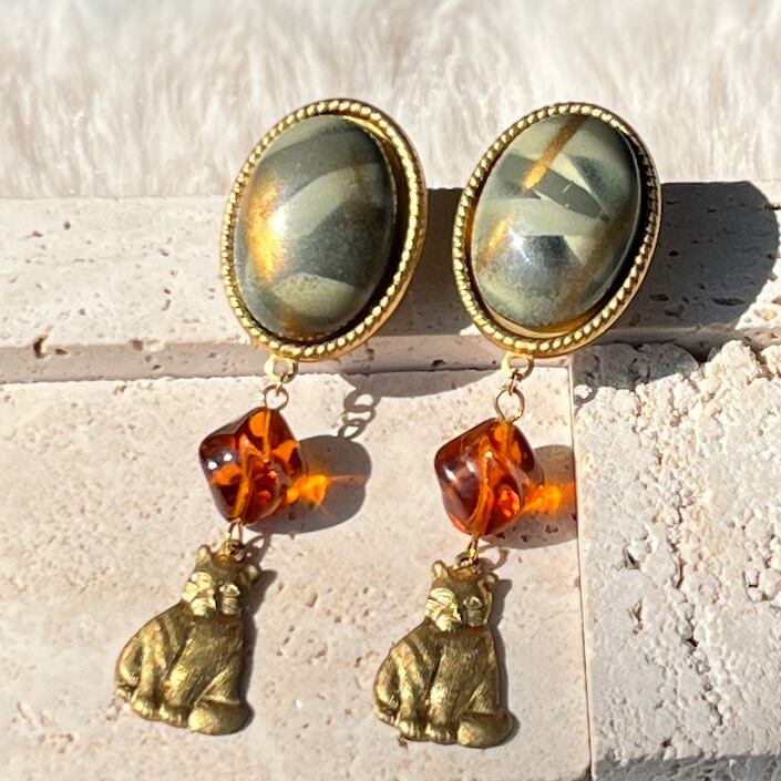 ヴィンテージビーズの迷彩系カボション ピアス &イヤリング 短毛猫 グリーン 緑 ブラウンビーズ付き