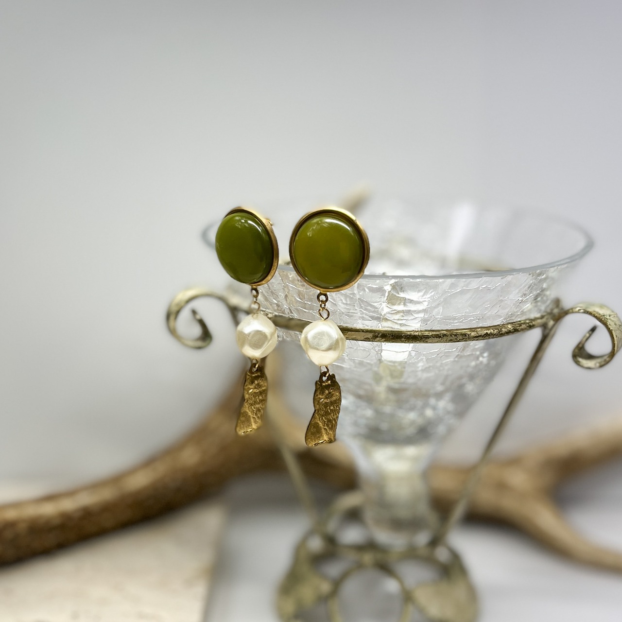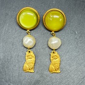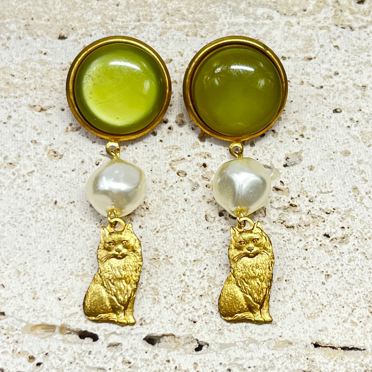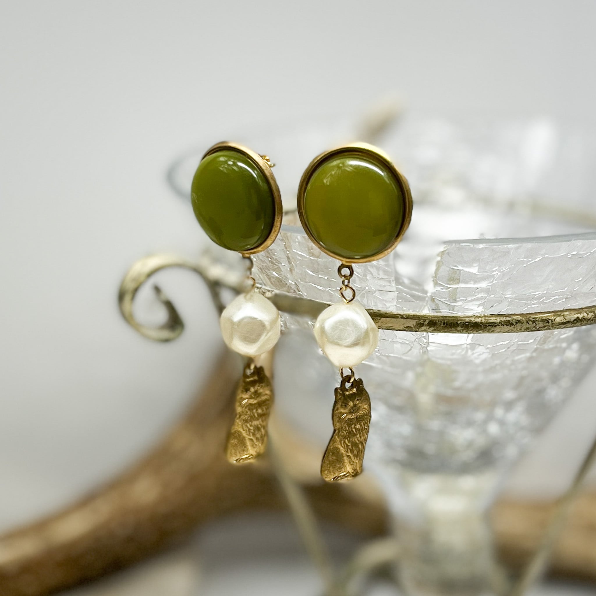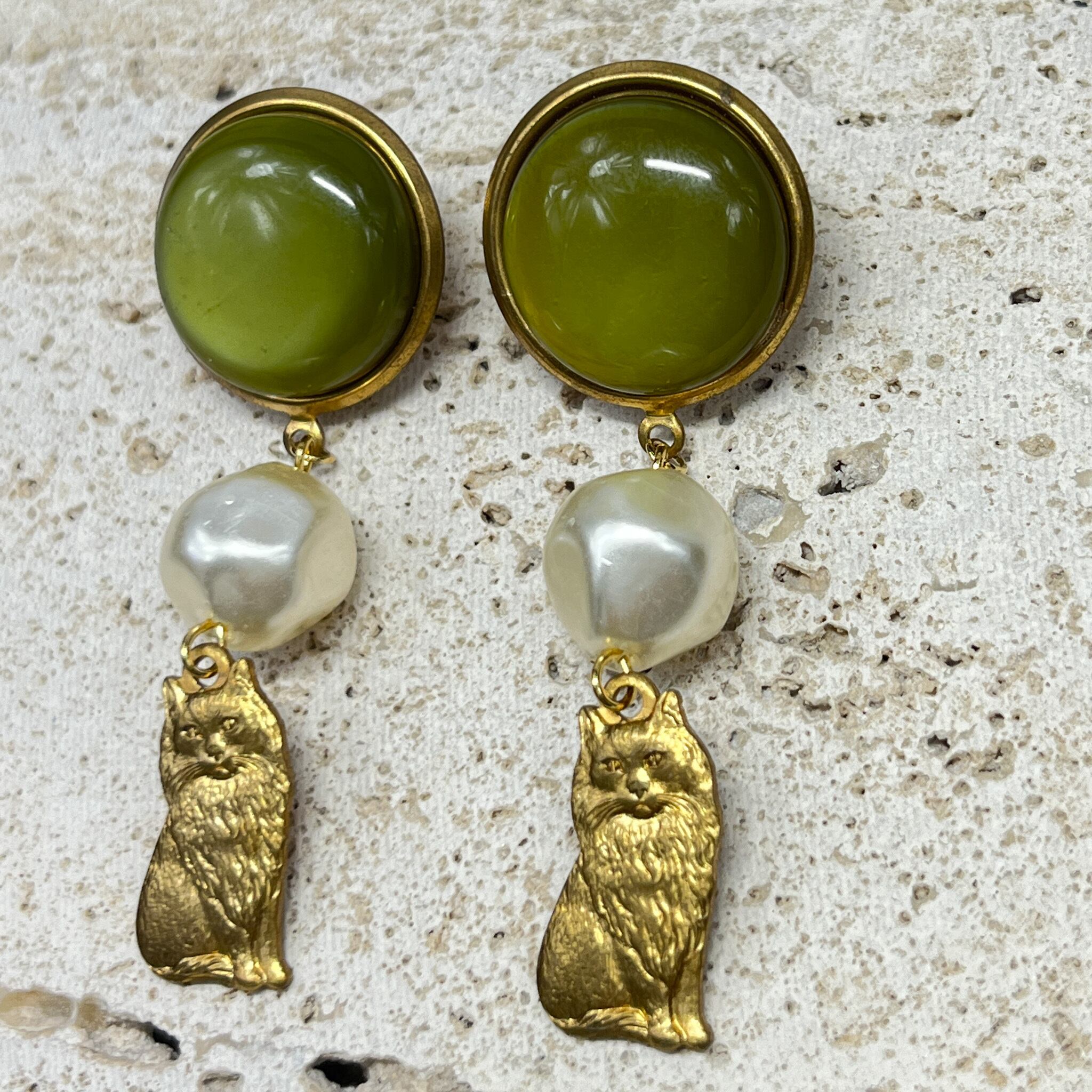 ヴィンテージビーズ スモーキーグリーンの猫ピアス&イヤリング バロックパール付き