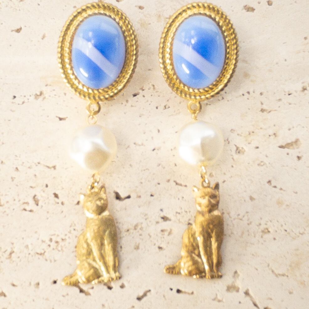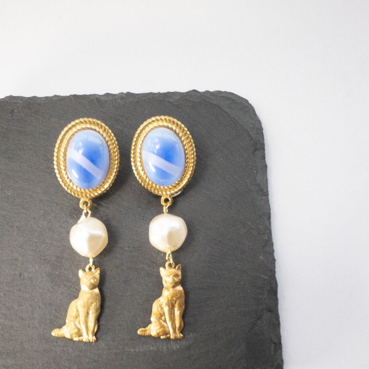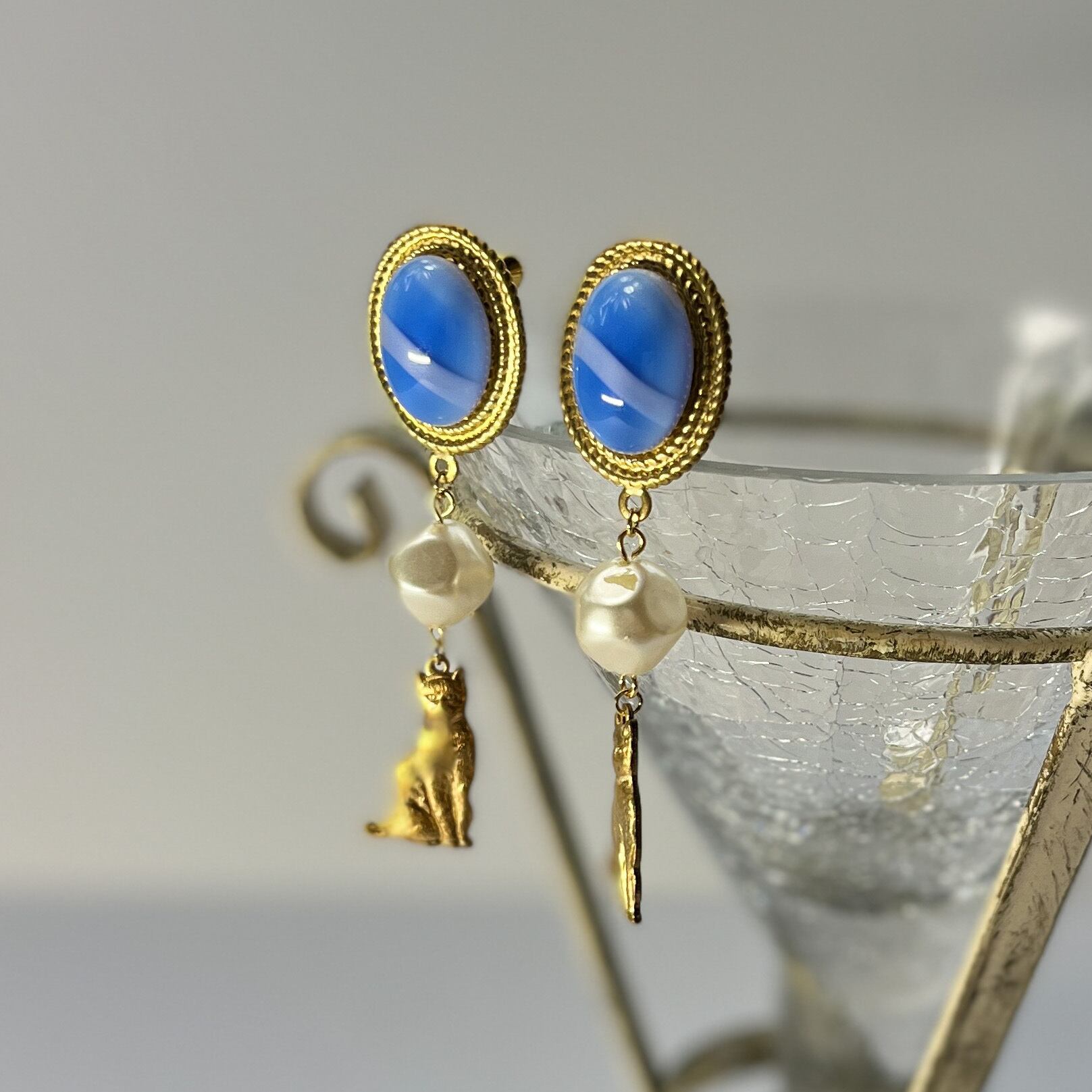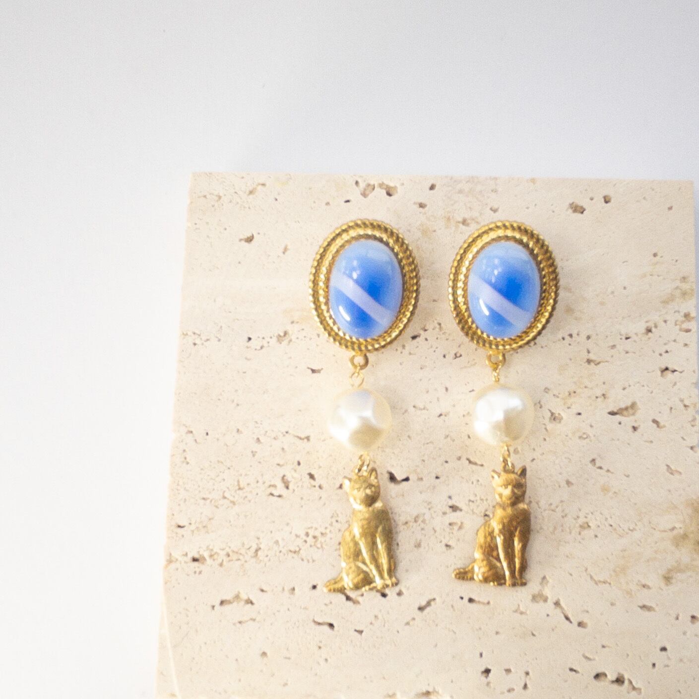 清々しいブルーにそよ風が吹いた様なラインが入ったカボションがにバロックパールを合わせて猫イヤリング&ピアスを作りました。