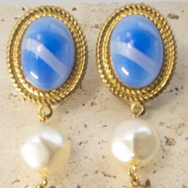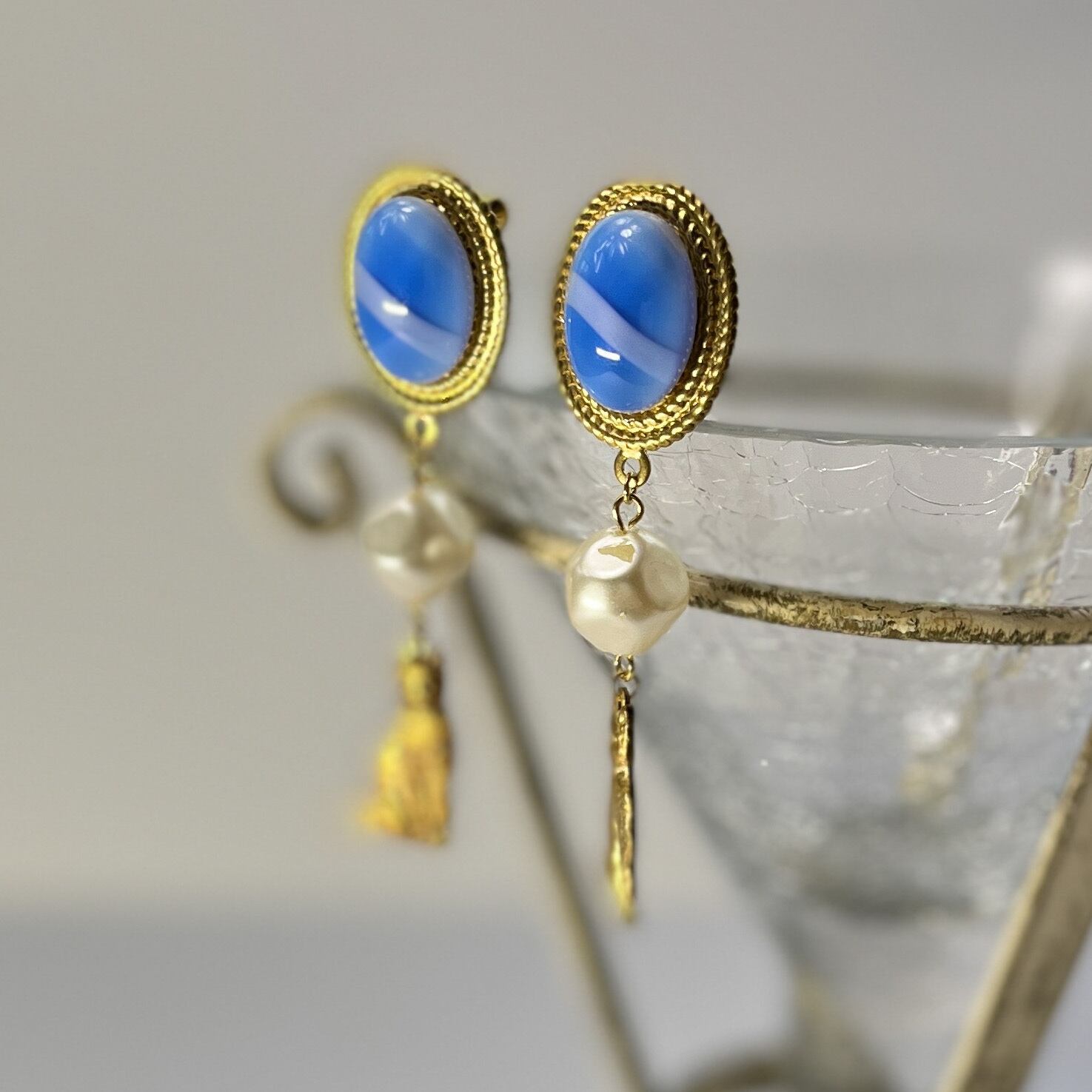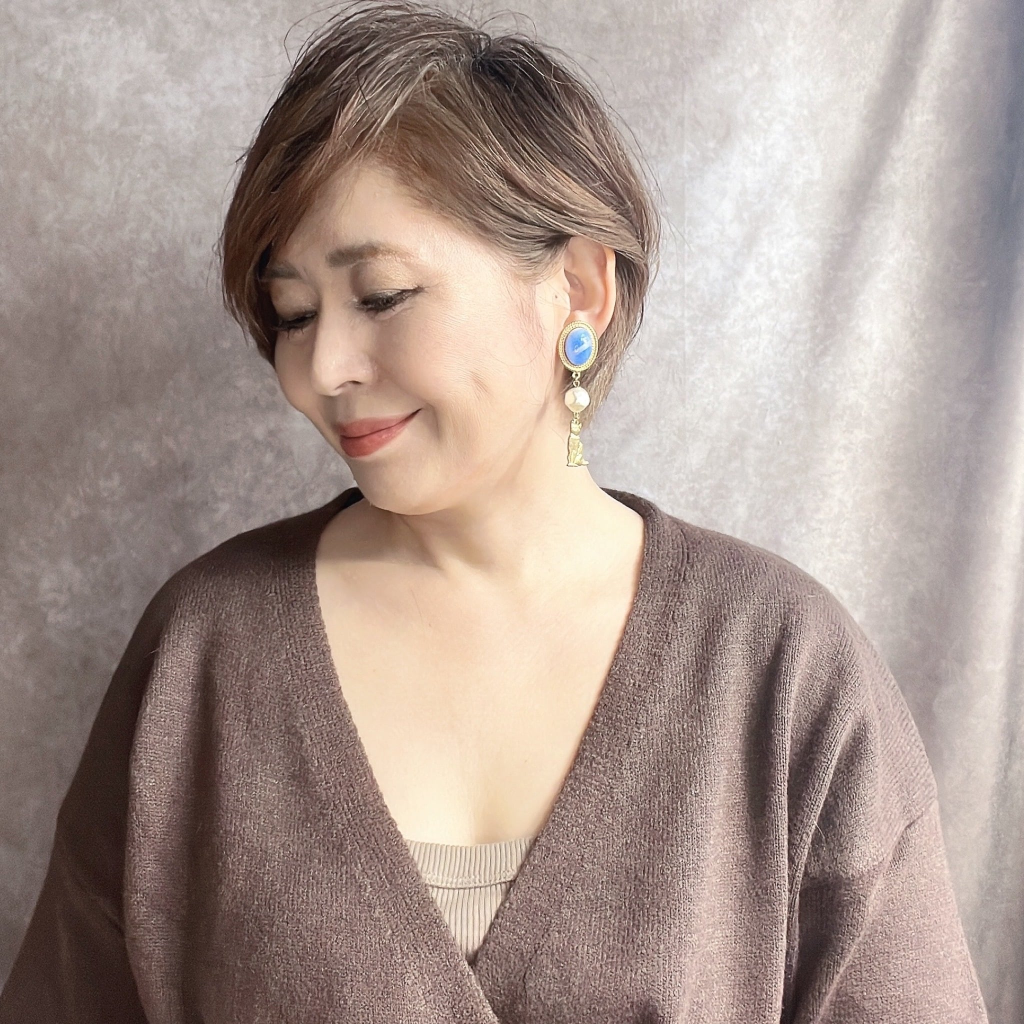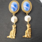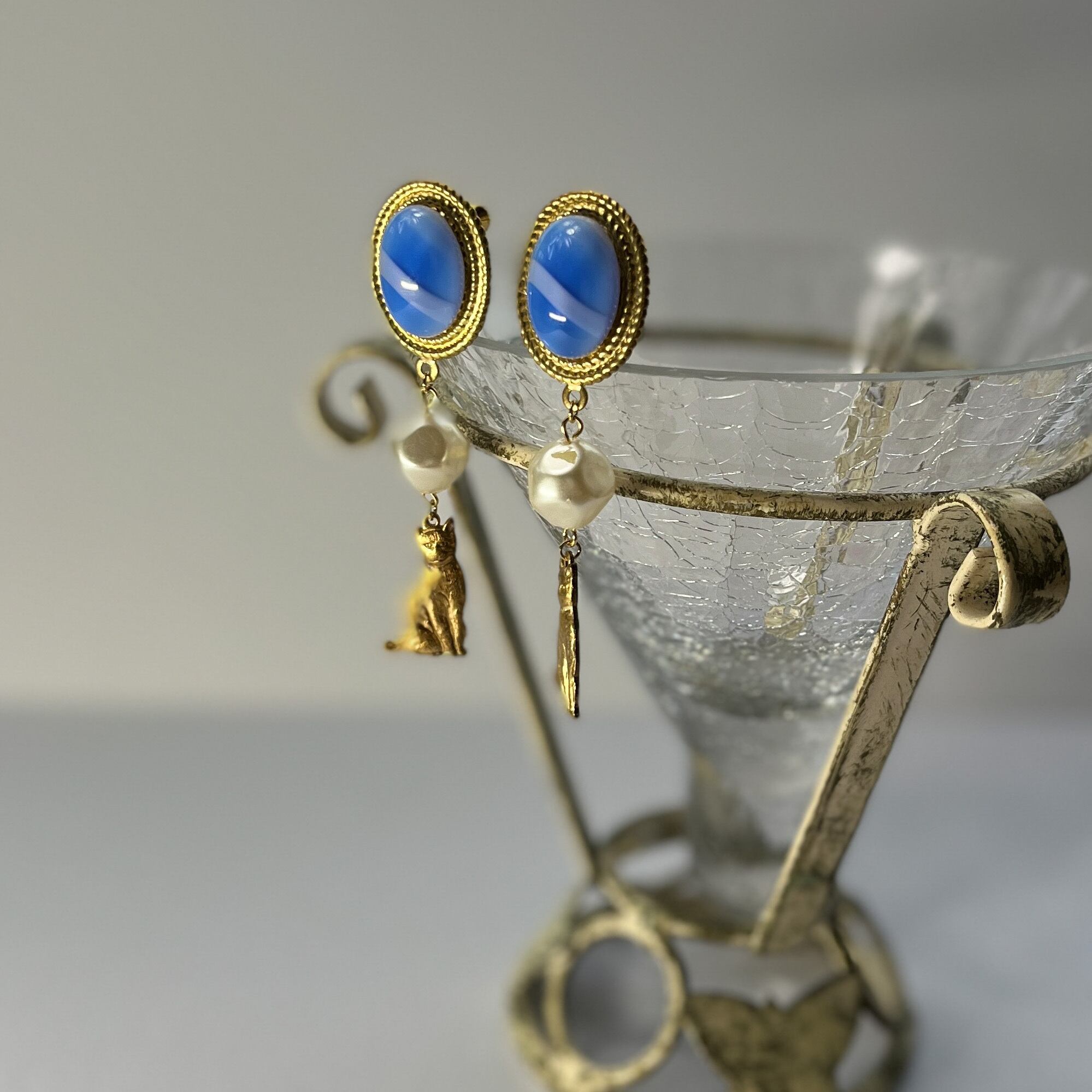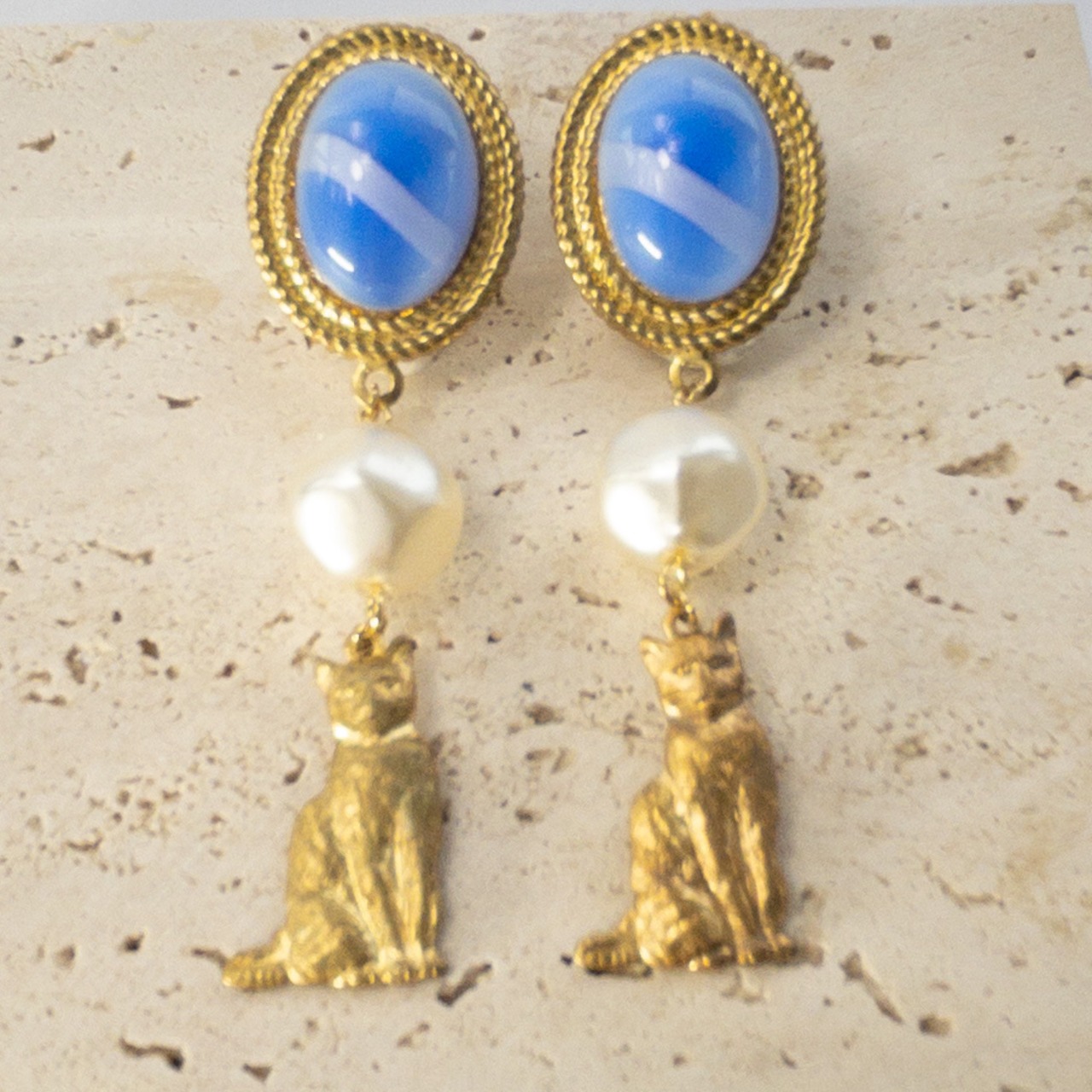清々しいブルーにそよ風が吹いた様なラインが入ったカボションがにバロックパールを合わせて猫イヤリング&ピアスを作りました。