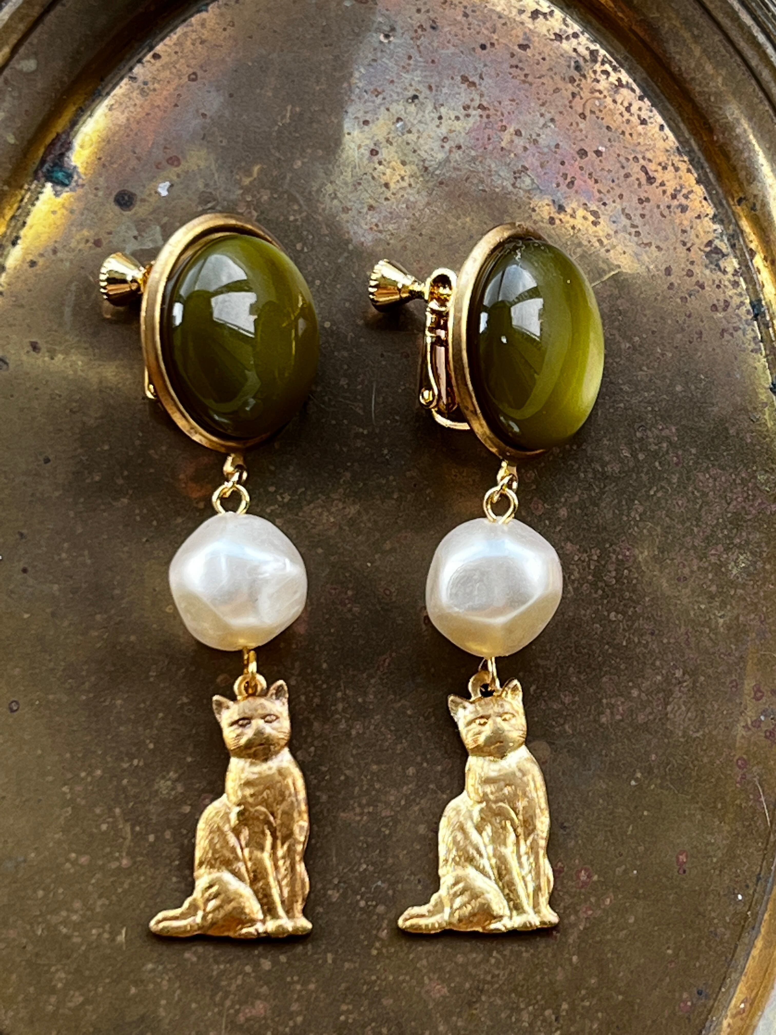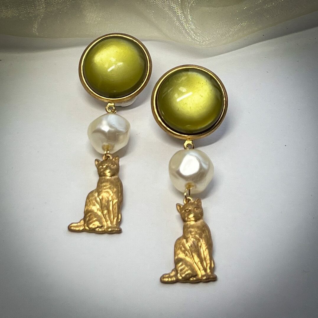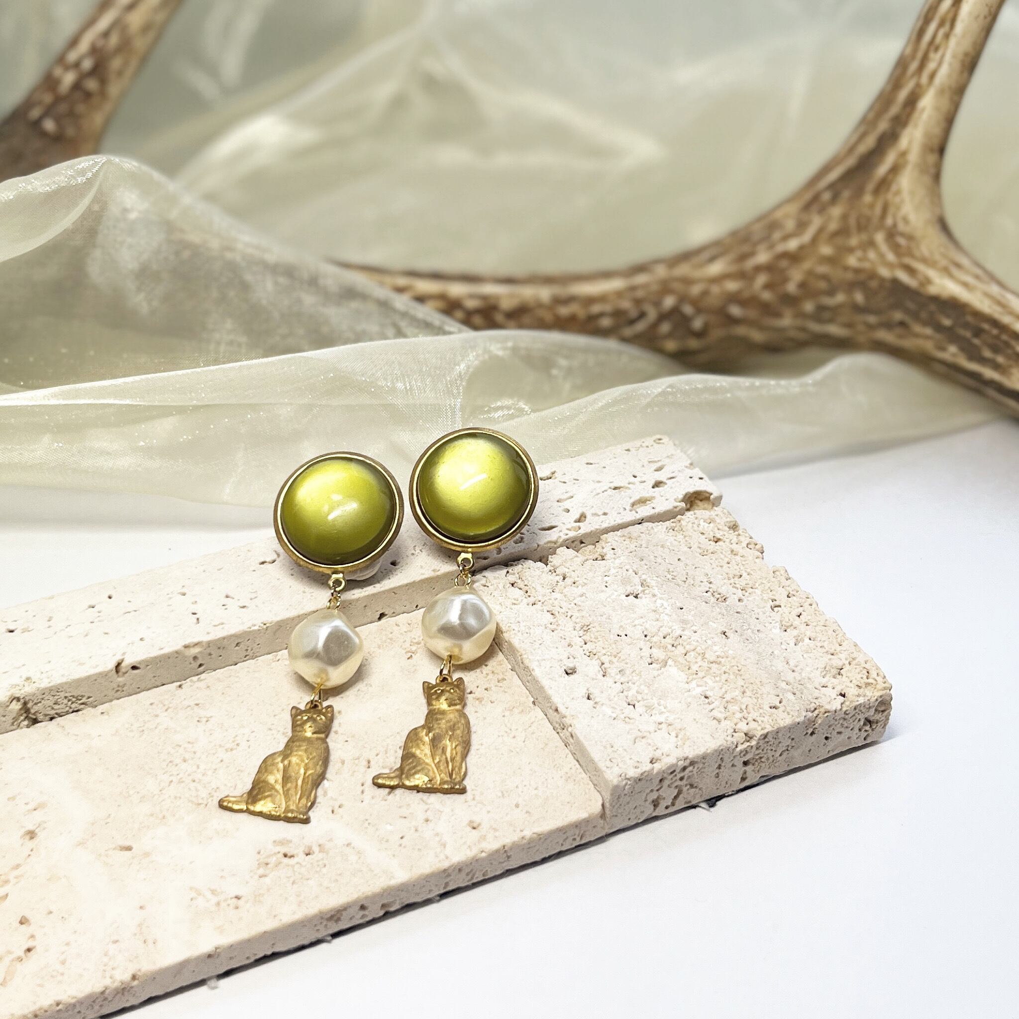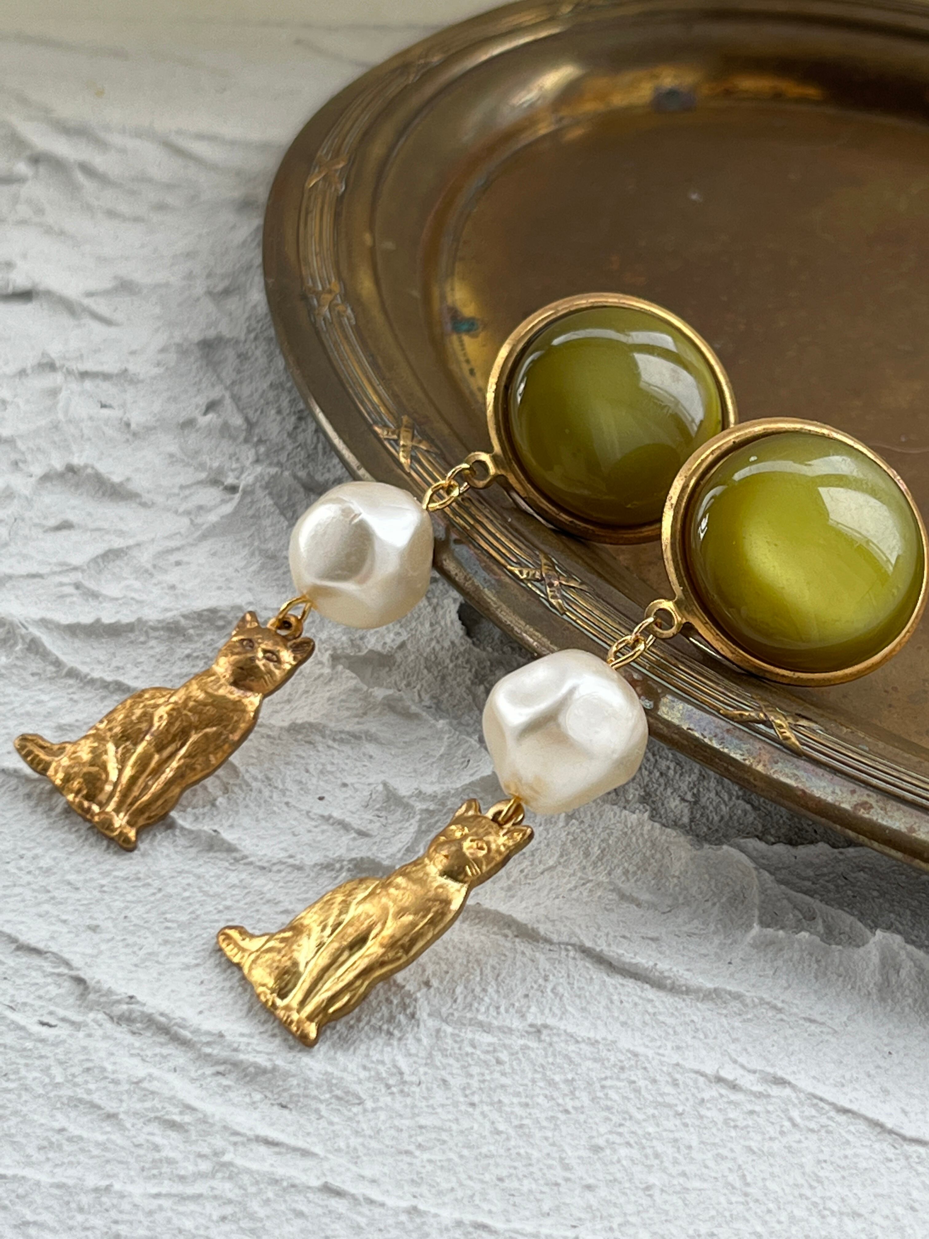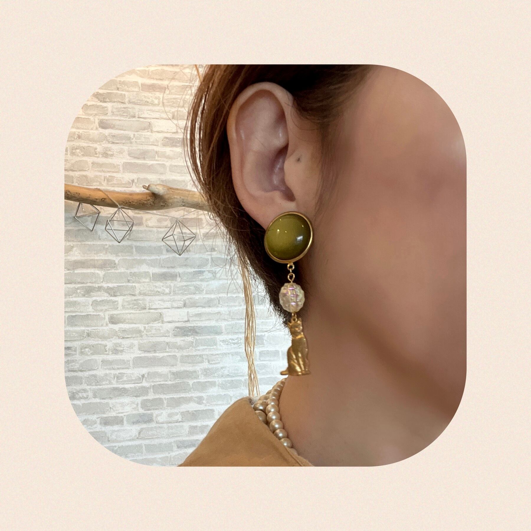 ヴィンテージビーズのスモーキーグリーン猫ピアス&イヤリング バロックパール付き